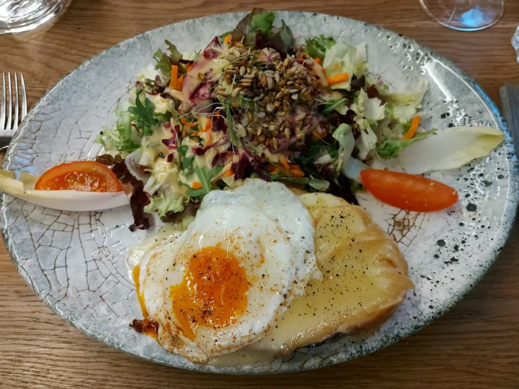Bei einem weiteren Besuch wählte ich eine Käseschnitte mit Salat. Die Käseschnitte wurde mit dem Salat zusammen auf dem gleichen Teller serviert. Der Salat war frisch, mit verschiedenen Kernen bestreut. Das Dressing war gut, jedoch eher Essig-betont. Neben dem Salat war die Käseschnitte mit einem Spiegelei.
