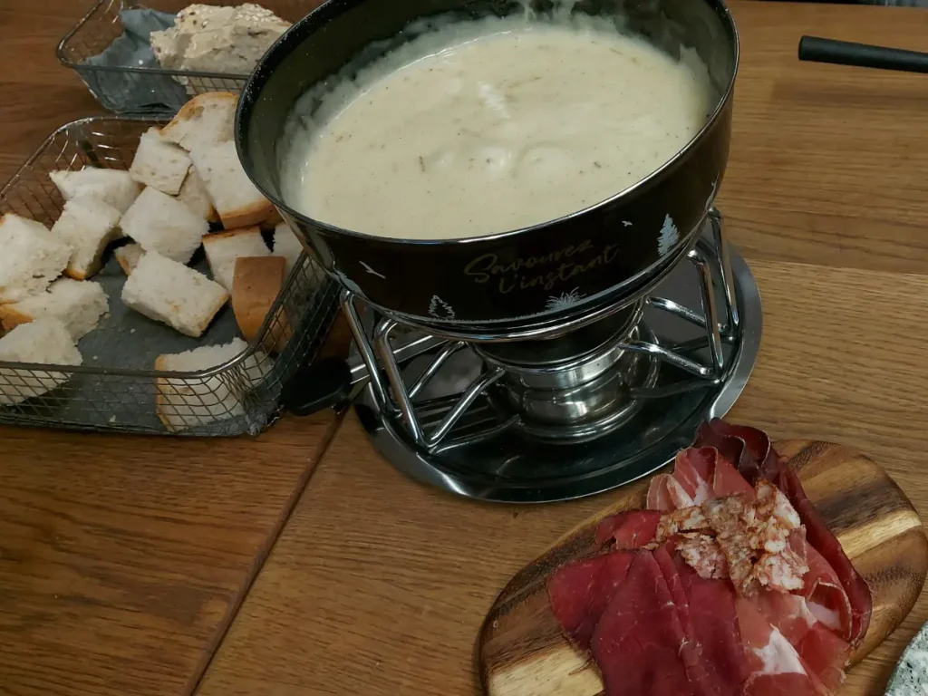 Ein kleiner Wermutstropfen war ein leicht verbrannter Nachgeschmack, obwohl das Fondue im Caquelon selbst nicht direkt angebrannt war. Dies könnte auf die Zubereitung im Vorfeld zurückzuführen sein. Der Fleischteller mit Trockenfleisch, Rohschinken und einer fein geschnittenen Trockenwurst rundete das Mahl gut ab.