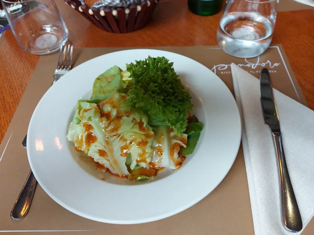 Mein Go-to für Vorspeisen bei Pizzerien ist ein Salat. Dieser war im Pomodoro jeweils frisch. Die Sauce war jeweils ein mildes, ausgewogenes italienisches Dressing. Dabei stand der Essig nicht zu sehr im Vordergrund – was ich mag. Besonders mag ich die Brötchen aus Pizzateig, welche dazu gereicht werden.