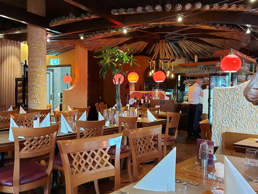 Beim Betreten des Restaurants fällt einem das rustikale Interieur auf. Dazu tragen vor allem wuchtige Holztische mit entsprechenden Stühlen sowie das Aussehen der Lampen bei.